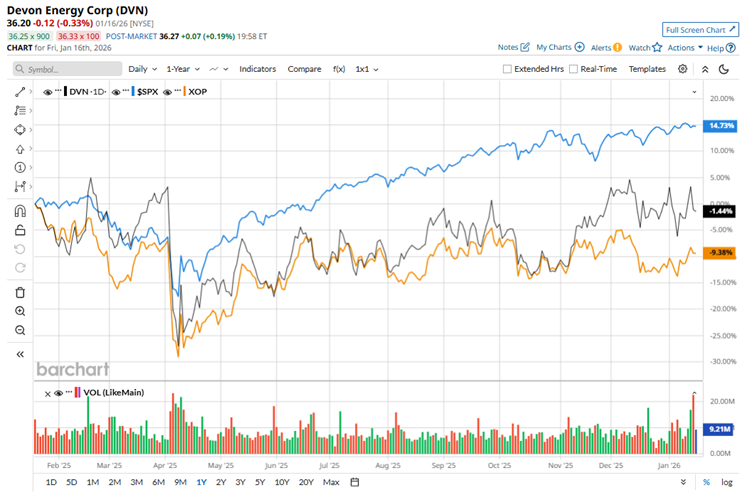 Devon Energy’s share price has had a relatively underwhelming run in 2025. Over the past year, the stock has slipped nearly 5.8%, trailing the broader S&P 500 Index ($SPX), which surged 16.9% over the same period. That said, the performance looks more resilient in a sector context. Compared with the SPDR S&P Oil & Gas Exploration & Production ETF (XOP), which tumbled 10.7%, Devon has held up considerably better.